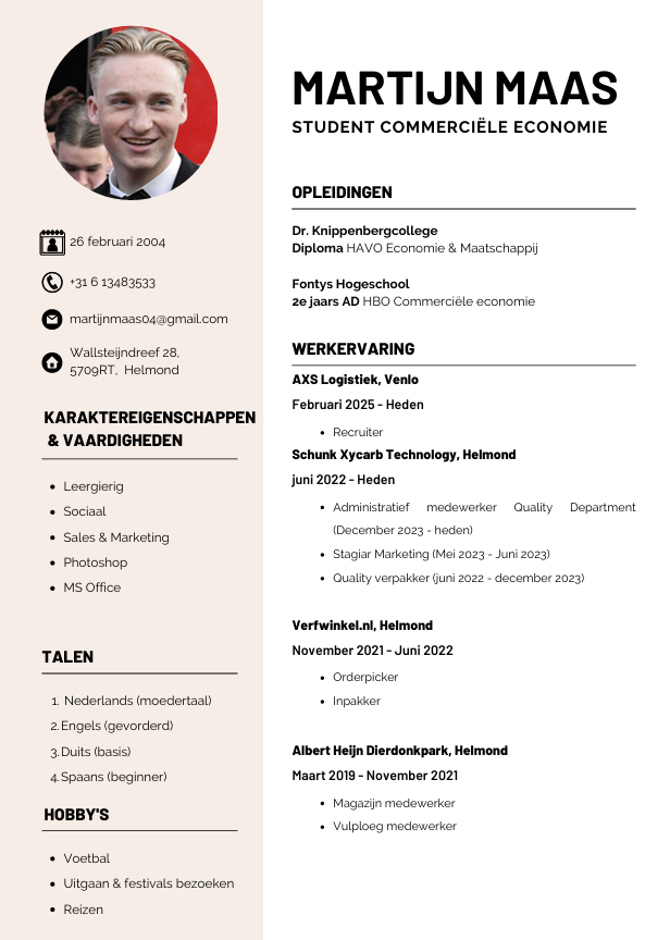 Ik ben een tweedejaars student commerciële economie die graag praktijkervaring opdoet en nieuwe dingen leert. In verschillende banen heb ik samengewerkt met anderen en verschillende type mensen, waardoor ik flexibel inzetbaar ben. Mijn studie sluit aan op mijn interesse in sales en marketing. Ik pak uitdagingen met enthousiasme aan!